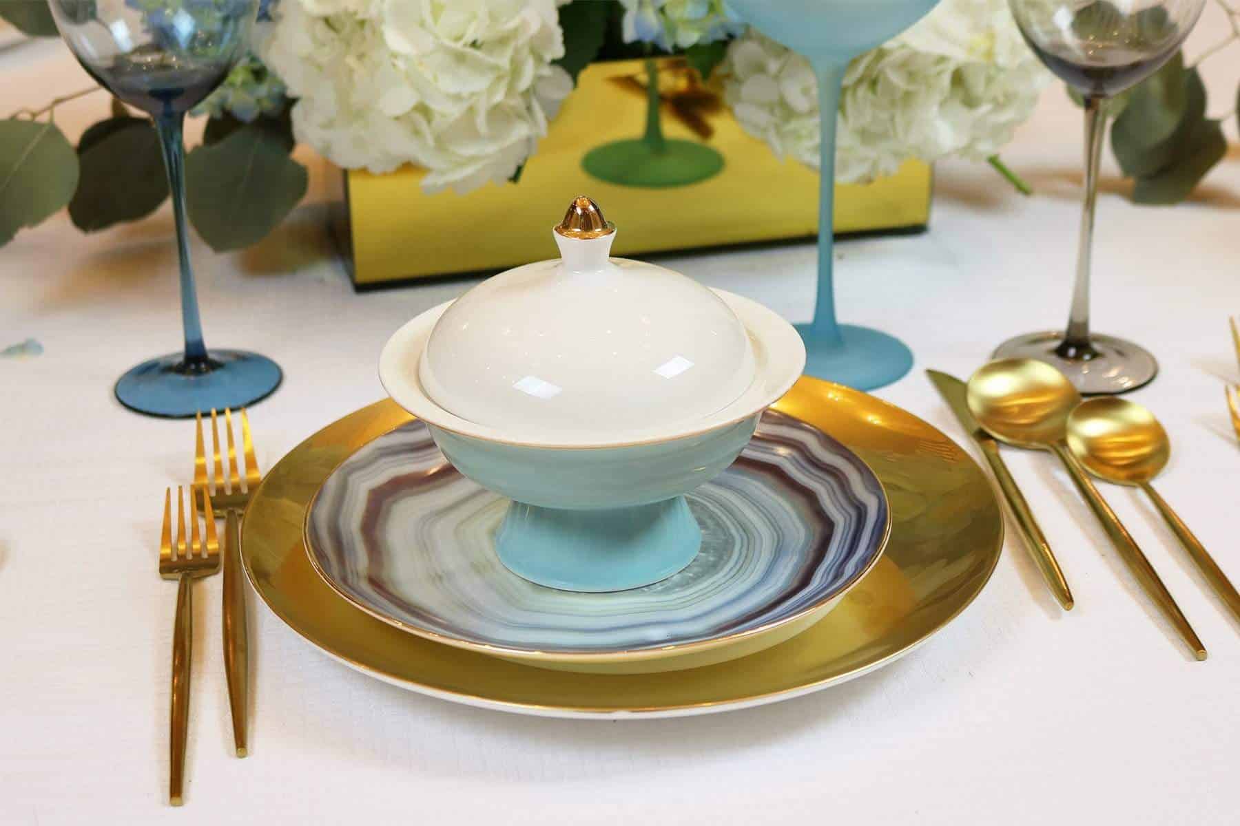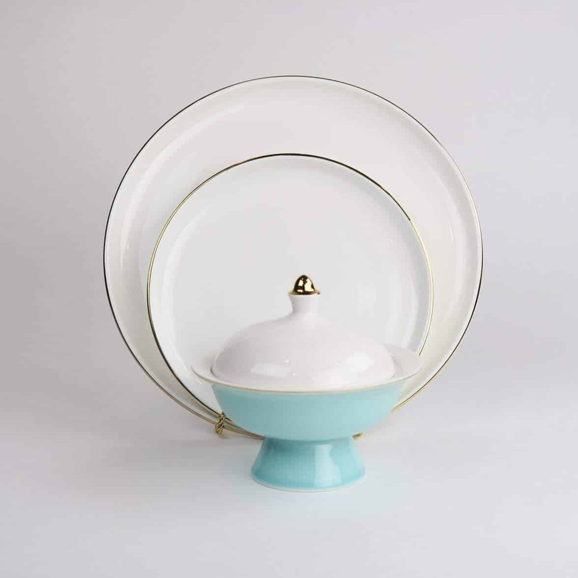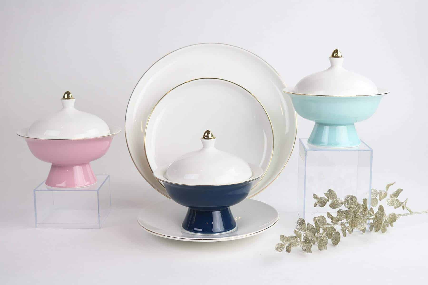 These adorable mini soup bowls somehow feel like they belong on the dinner table at the Versaille palace, as royalty dines in elegance. They are available in a choice of three colors-navy, light blue, and pink. Each bowl is propped up on a base of color, with a coordinating elegant lid that is studded with gold. The dinner and salad plates to this set are classy and elegant, yet simple so as to keep the bowls the conversation piece at the dinner table.