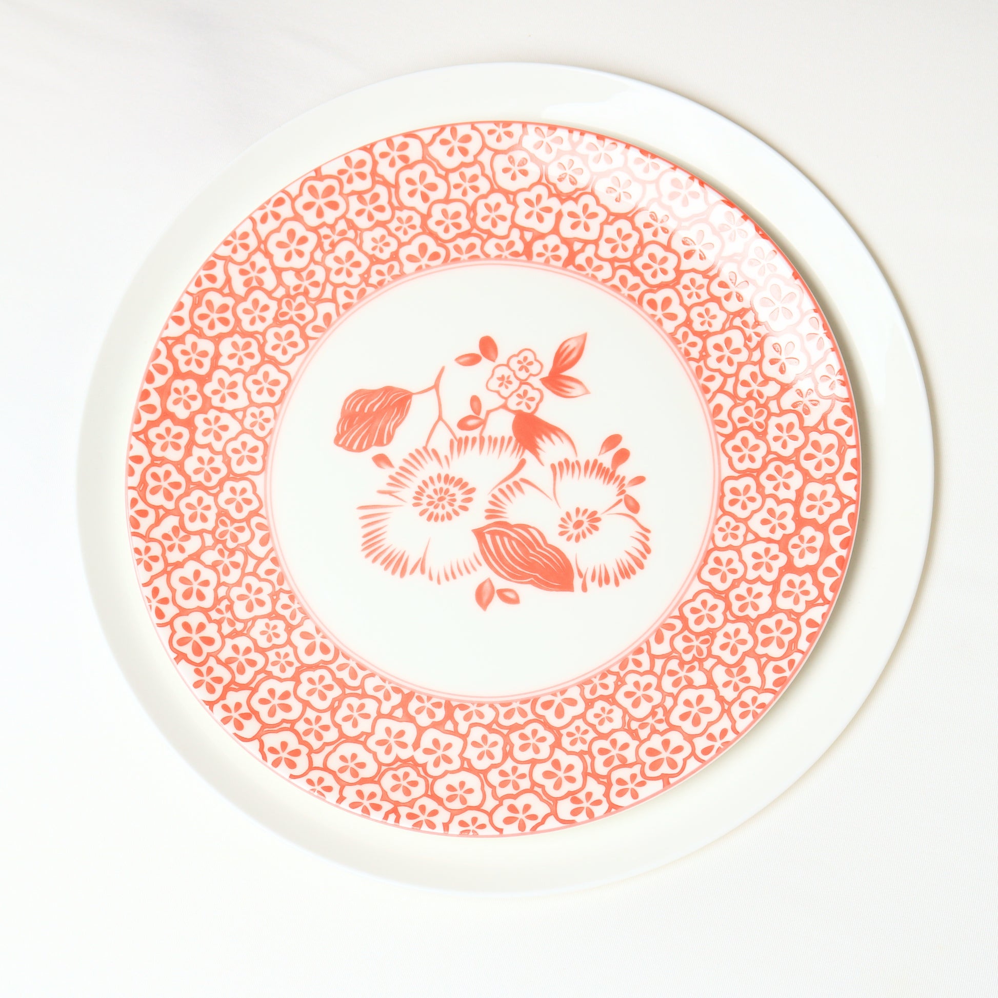 Bring a delicate yet vibrant touch to your table with our Pink Mosaic Accent Plate. Featuring a coral-colored mosaic pattern thickly detailed around the rim and a charming floral emblem at the center, this plate is both elegant and eye-catching.