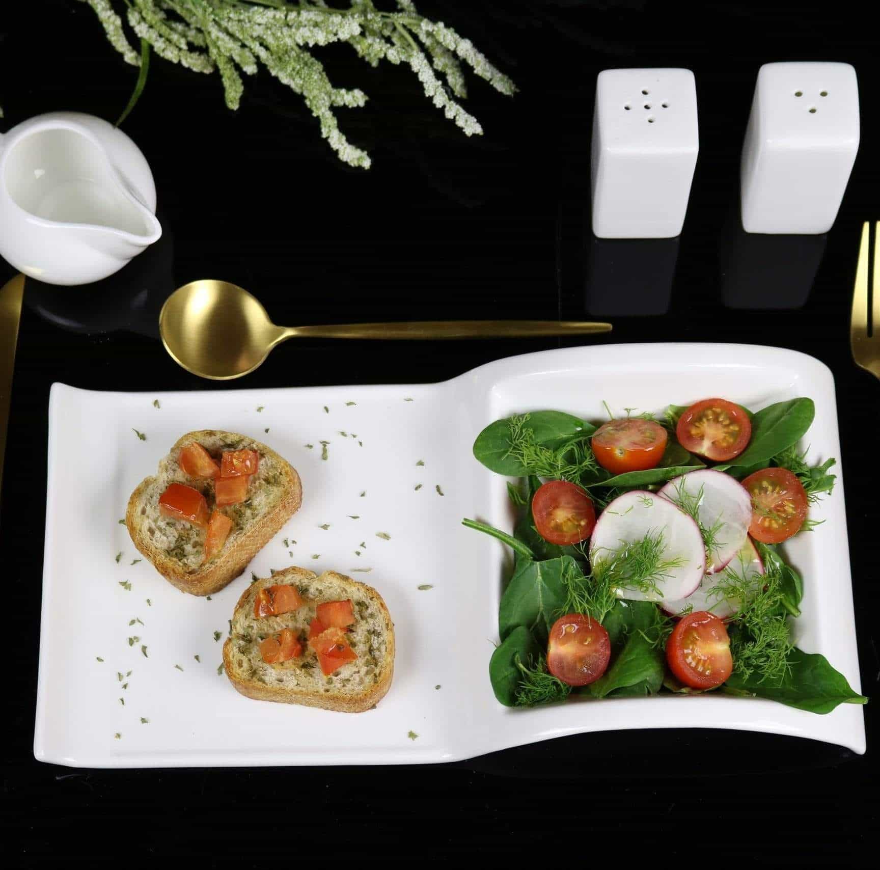 This sectional salad plate, with a square indentation, offers a awesome presentation for so many different foods. Be creative and you decide what you want to put inside. Place a salad in one side and your gourmet breads on the other.
