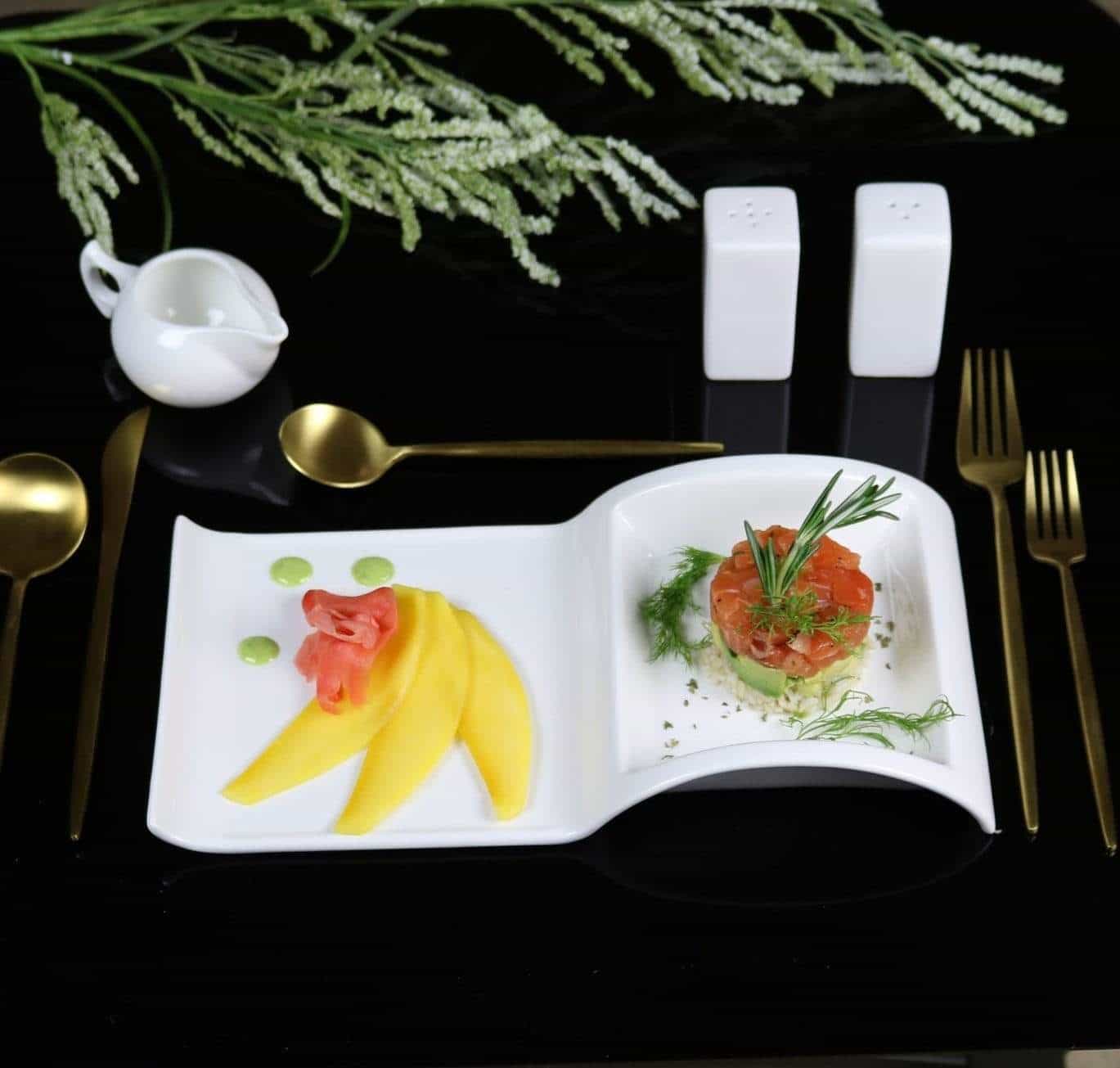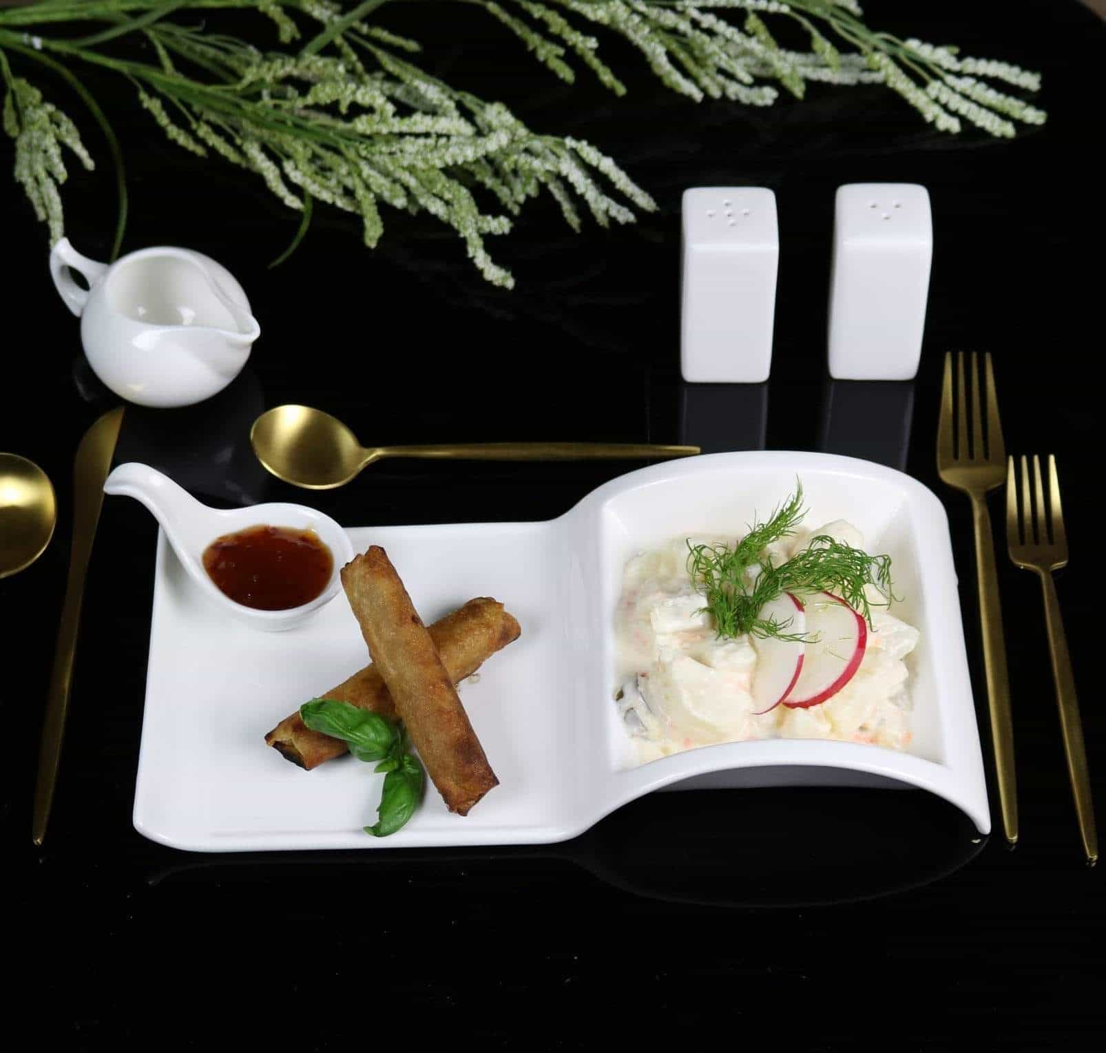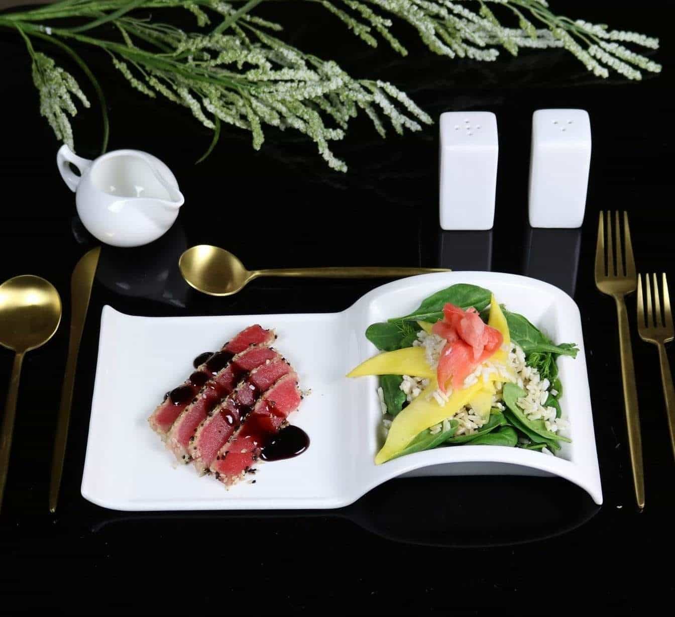 It can also be used to serve appetizers or desserts. You can put some rice and a saucy appetizer on one side, and a small cracker or bruschetta on the flat part.