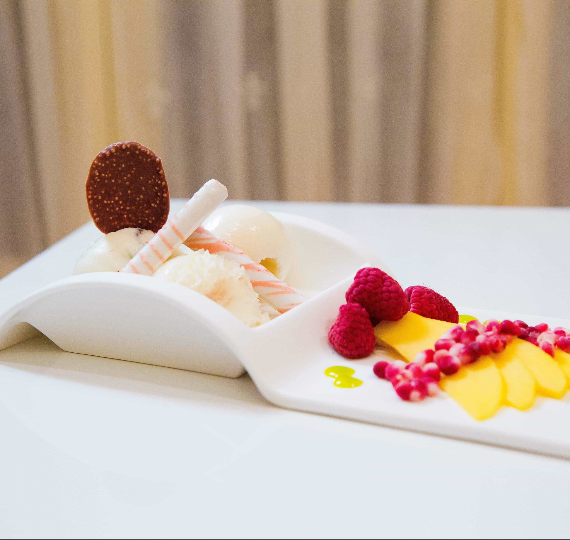 For dessert, some sorbet or ice cream in the deeper part, and some cake or chocolate on the flat area.